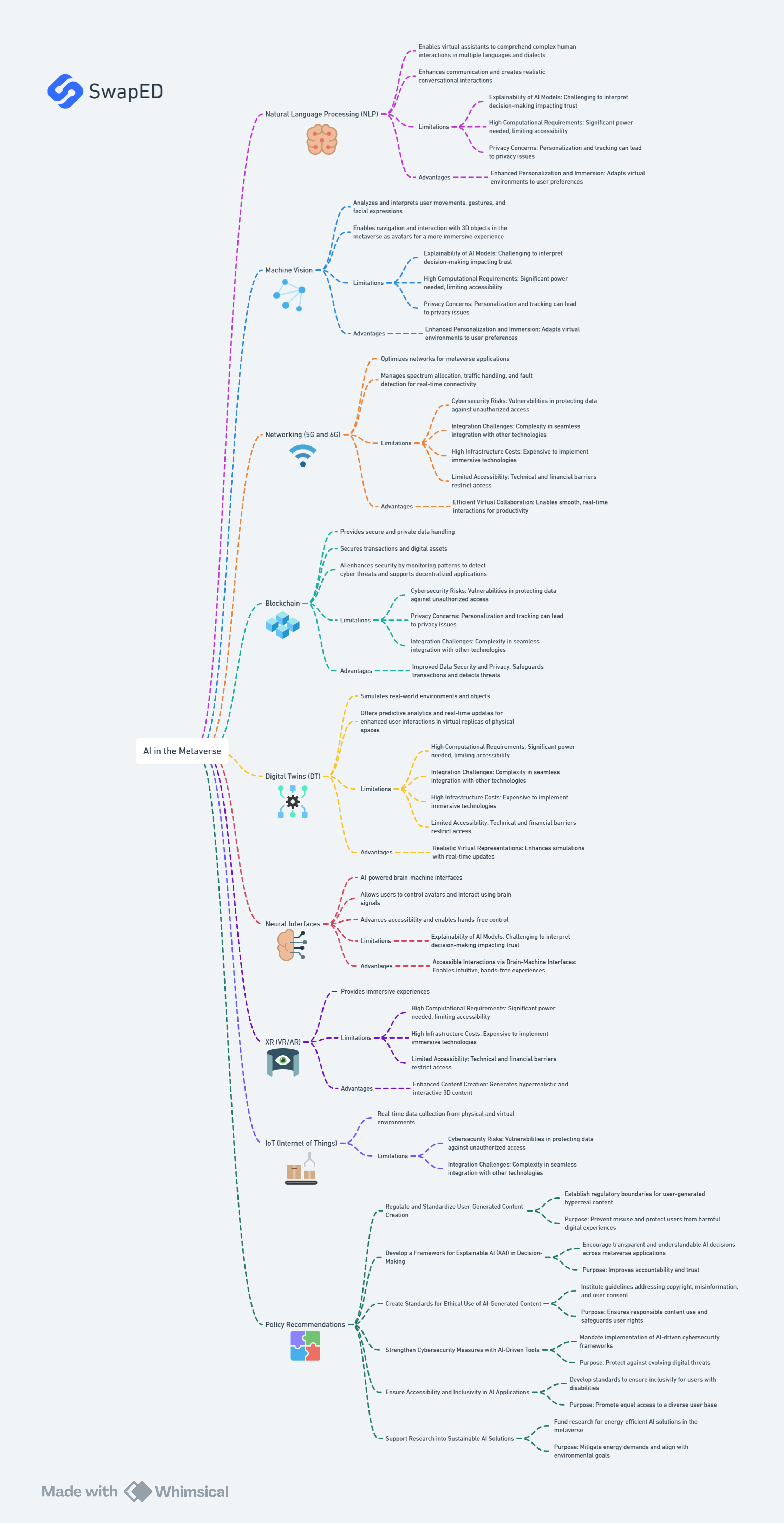 This one-page guide/ diagram provides a clear overview of AI’s pivotal role in the metaverse, showing how technologies like NLP, Machine Vision, and Blockchain intersect to shape virtual experiences. By examining key challenges and actionable policy recommendations, this guide highlights essential insights for understanding and navigating AI-driven innovation in the metaverse. Learning Outcomes Identify Core Technologies: Understand the main AI technologies driving metaverse experiences, including their applications and contributions. Analyze Challenges: Recognize common challenges such as security, explainability, and accessibility, and how they impact the metaverse. Explore Policy Recommendations: Learn actionable policy points that enhance security, ethics, and inclusivity within metaverse platforms.